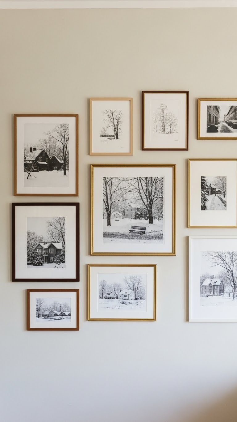 Framed against a pale, matte wall, a gallery of winter photography and ink sketches lets you curate a spare, contemplative mood that still feels warm and personal. You’ll mix monochrome prints with delicate hand drawn studies, varying scale and frame finish for rhythm.