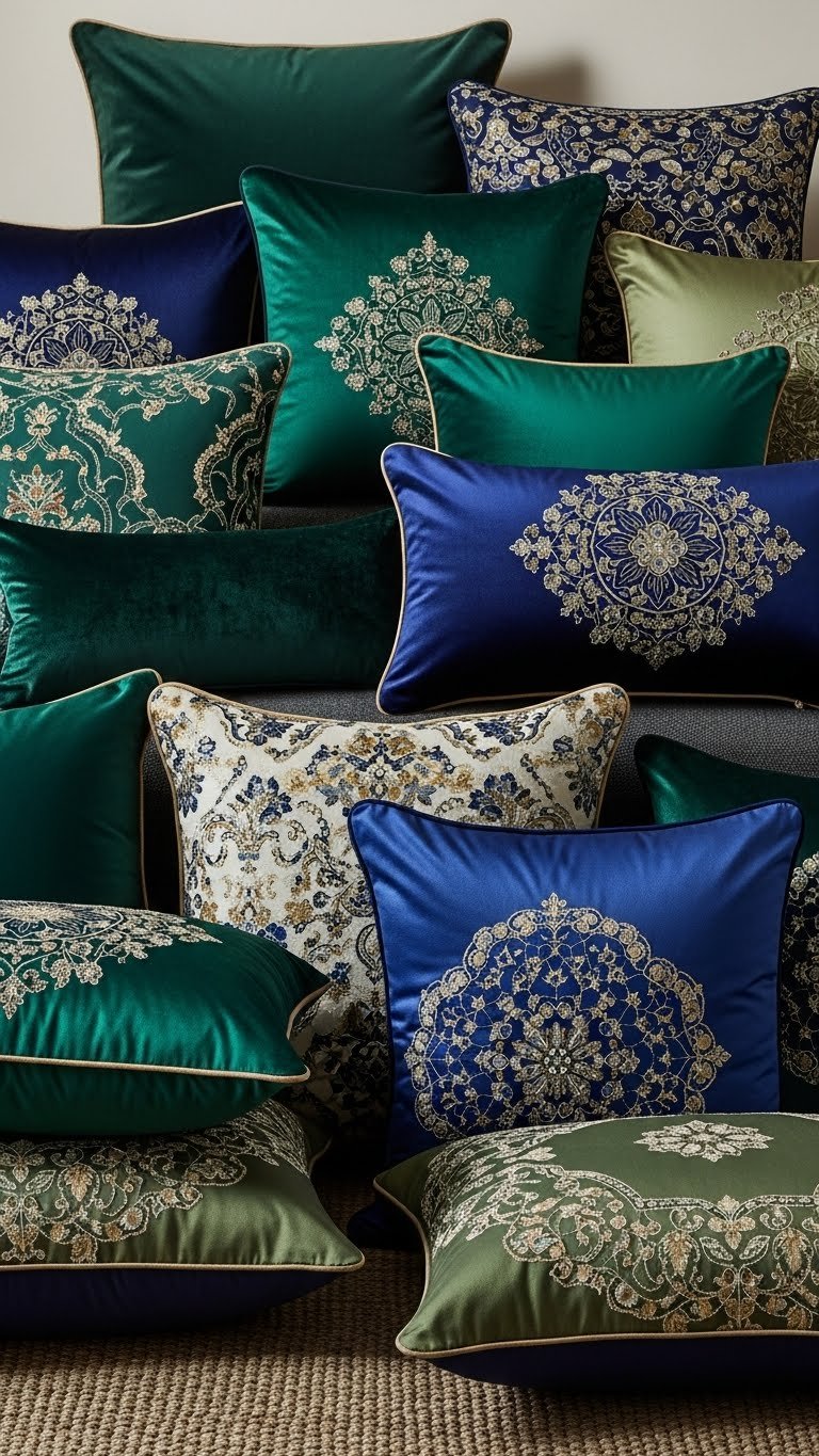 You’ll choose velvet in emerald or sapphire, pair silk embroidery for tactile richness, and add metallic piping for a polished edge.
