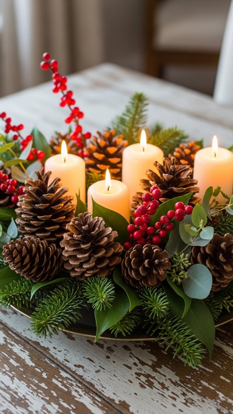 When you bring pinecones and berries together in a centerpiece, they create an effortless, natural focal point that feels both seasonal and refined. You’ll pair rustic pinecones with sprigs of winter berries, add greenery and candles, and arrange them in a low tray or bowl.