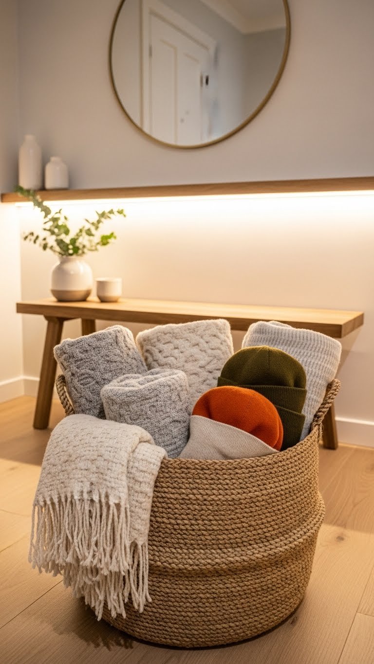 In an entryway basket styled with blankets and hats, you’ll create a practical focal point that feels effortlessly curated. Use woven baskets to contain textured throws and neatly folded wool caps, mixing neutral tones with one bold accent.