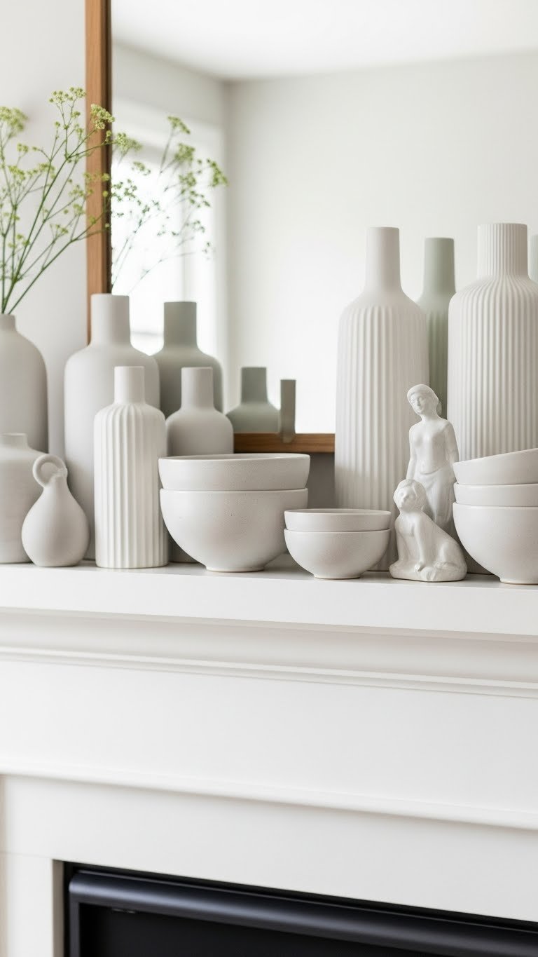 When you place ceramic and porcelain accents on your mantel, they’ll anchor the space with tactile elegance and sculptural form. Choose pieces with matte glaze and varied sculpted silhouettes to create rhythm without clutter.