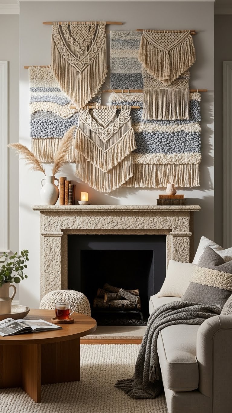 Let the tactile calm of your mantel continue upward by adding textured wall hangings to introduce cozy scale and visual depth. You’ll choose woven macramé pieces and boucle tapestries to layer warmth without clutter.