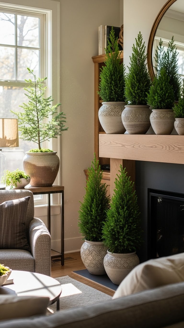 Tucked into a corner or flanking your mantel, mini evergreen trees in decorative pots bring structured greenery and seasonal charm without overwhelming the room. You’ll choose mini potted specimens and sculptural ceramic pots to craft confident evergreen arrangements.