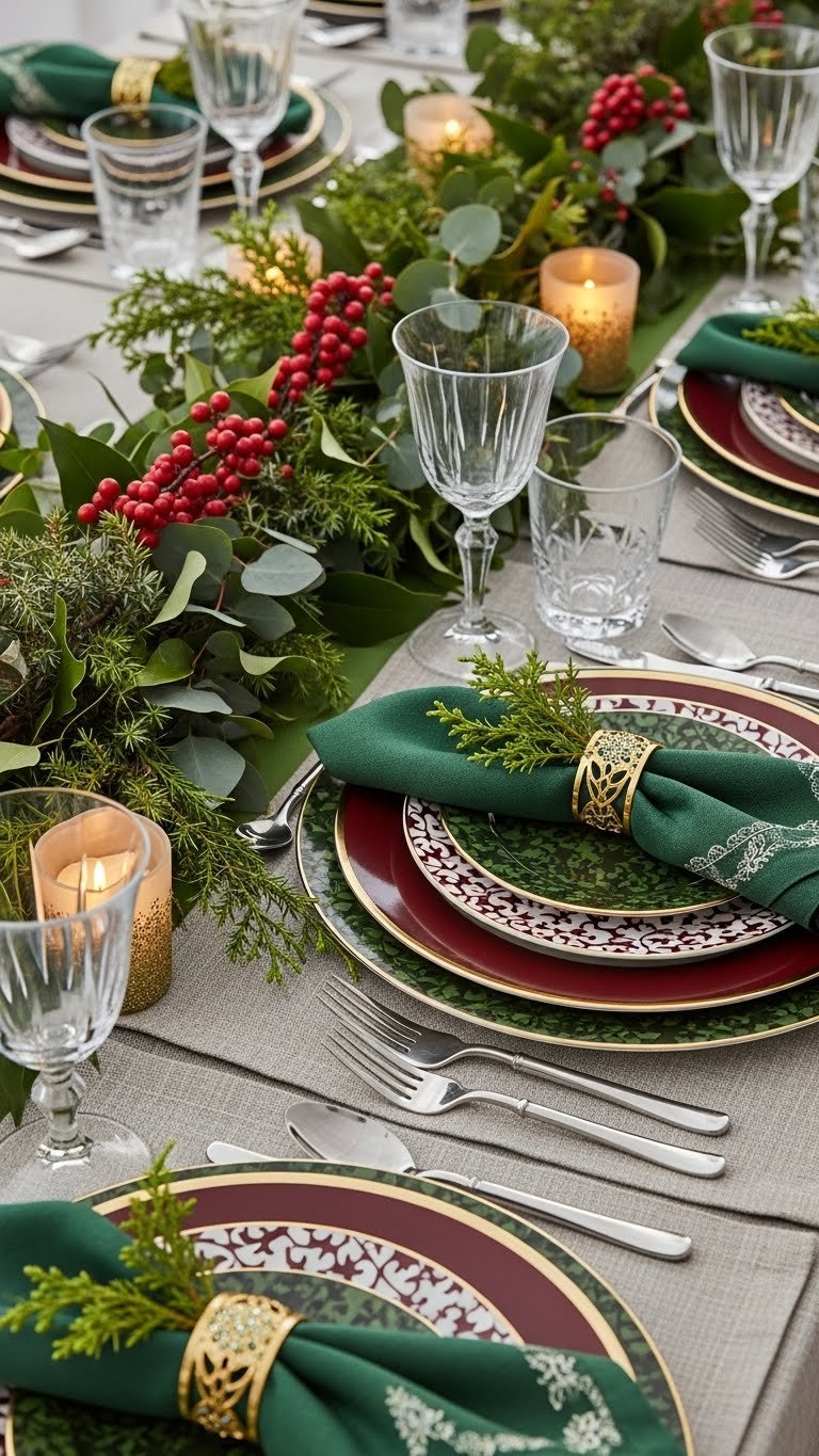 Mix and match boldly to give your holiday table a curated, collected look that still reads cohesive. You’ll layer plates, napkins, and chargers in confident pattern play, anchoring contrasts with neutral linens.