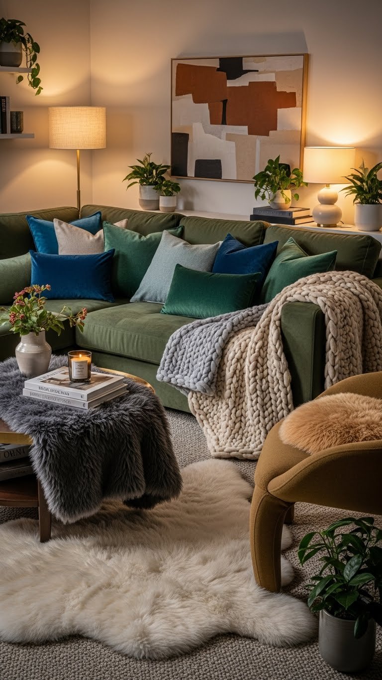 After the plush velvet pillows set the tone, bring in wool throws and faux-fur accents to introduce warmth and tactile contrast. You’ll use wool layering to create structure and effortless coziness—drape throws over sofas, stools, or bench corners.