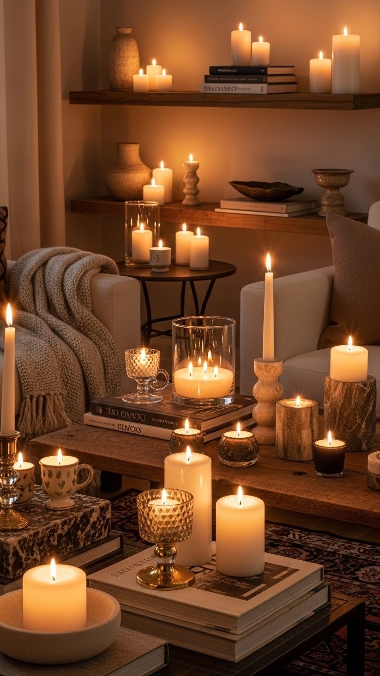 Scatter a few candles around seating areas and shelves to add instant warmth and a soft, flickering ambiance that feels both intimate and curated.