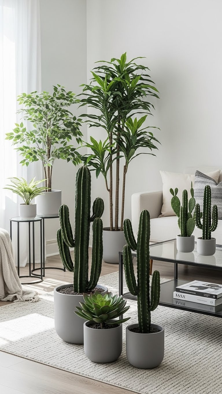 Using faux house plants gives you the look of lush greenery without upkeep, so choose pieces with realistic textures and scaled proportions that suit each room. You’ll mix silk succulents and a minimalist cacti arrangement for clean, modern moments, placing them where light would fall naturally.