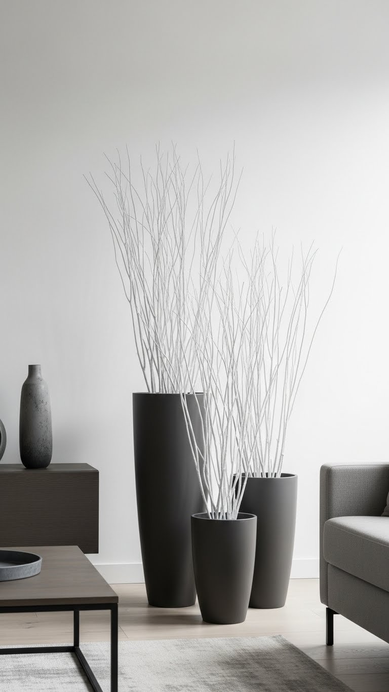 With tall planters anchoring a room, place faux branches to add vertical drama and effortless winter height without maintenance. You’ll create a striking tall twigscape that reads modern and liberated.