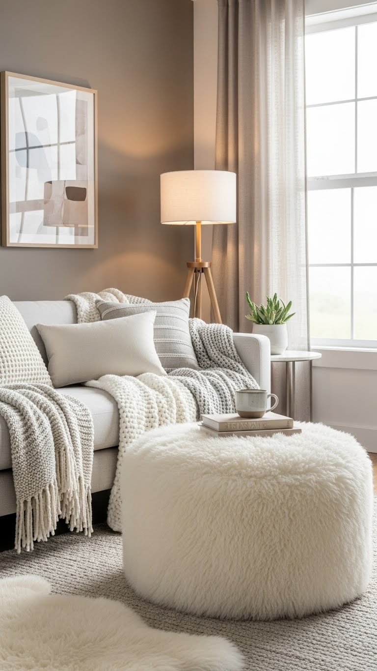 Roll in a layer of sheepskin and textured throws to instantly elevate winter comfort and visual depth. You’ll place a sheepskin ottoman or 天然羊皮垫 near seating, drape chunky knit throws over a sofa, and create a layered footstool or 叠放脚凳 for cozy lounging. Mix neutral tones, vary pile lengths, and keep arrangements relaxed yet intentional for liberated, modern warmth.