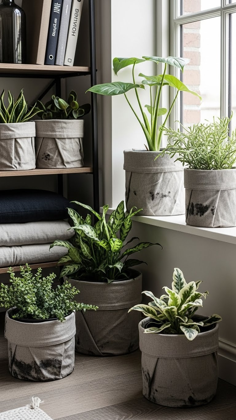 To complement that curated shelf, bring the same mix of texture down to the floor and windowsill with distressed planters wrapped or paired with linen. You’ll use linen textures and linen layering to soften rough edges, highlight planter patina, and let plants feel lived-in rather than staged.