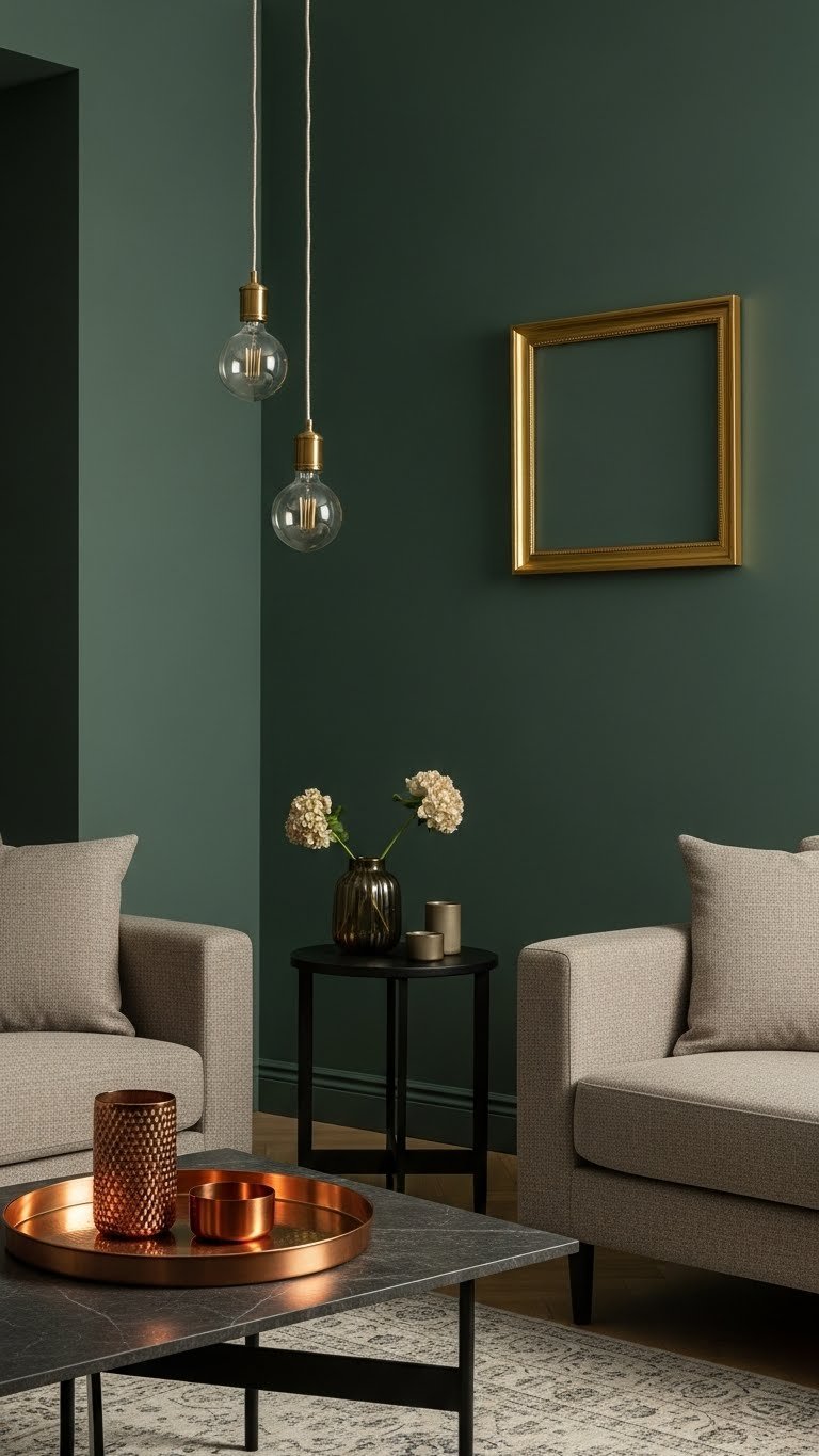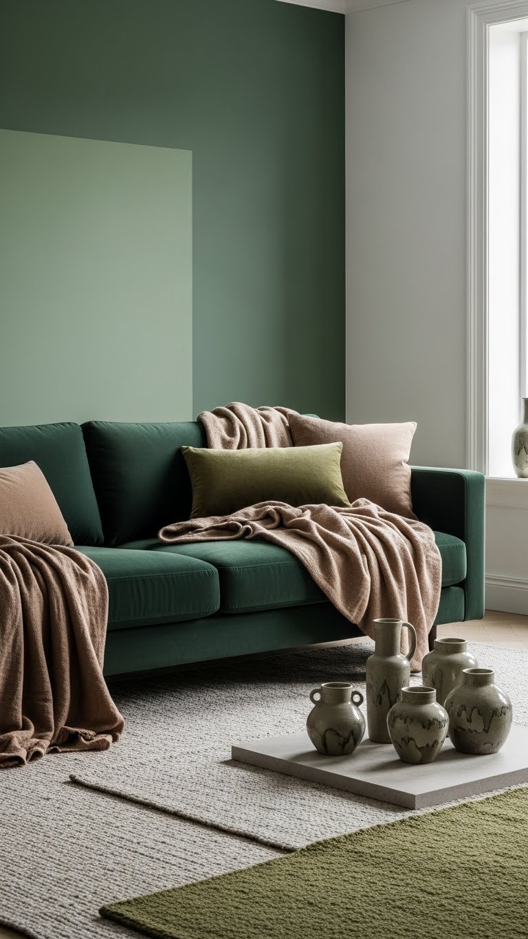 Choose a deep forest sofa or accent wall and layer mossy taupe throws, rugs, and ceramics. You’ll create a calm, liberated atmosphere that reads modern and timeless. Balance saturation and texture to keep the palette fresh and uncluttered.