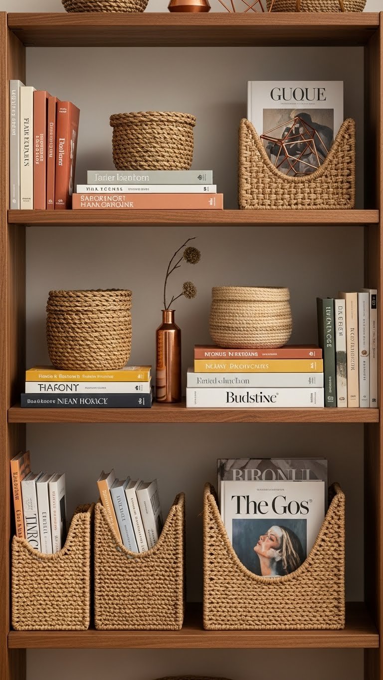 You’ll mix textured baskets with stacked books, curated covers forward, and a woven magazine or two for relaxed organization.