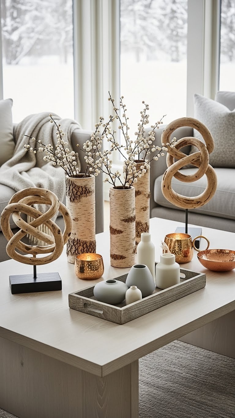 You’ll choose driftwood sculptures, birch bark vases, and reclaimed-look trays to add organic texture.