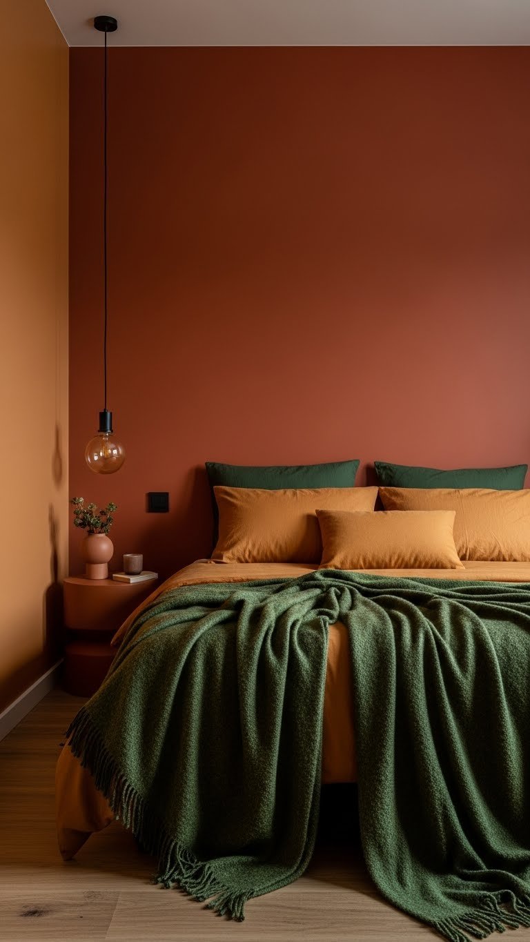Choose a terra cotta accent wall, moss green throws, and ochre cushions to anchor the room. You’ll create a liberated, earthy refuge that calms the mind and invites slow mornings, bold yet minimal — intentional color that feels both luxurious and free.