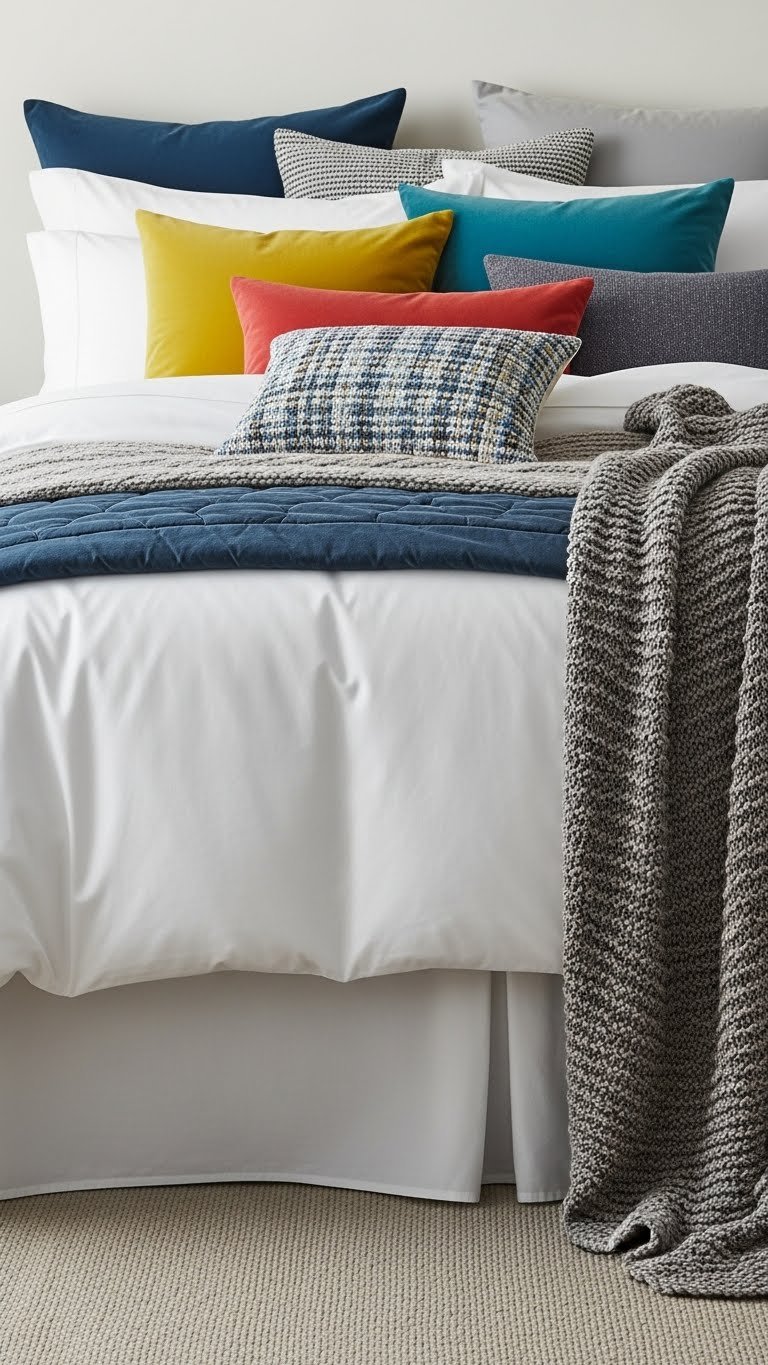 Often you’ll start with a crisp base layer—think soft percale or linen sheets—then add a mid-weight quilt or duvet and finish with textured throws and pillows to build visual depth and tactile warmth.