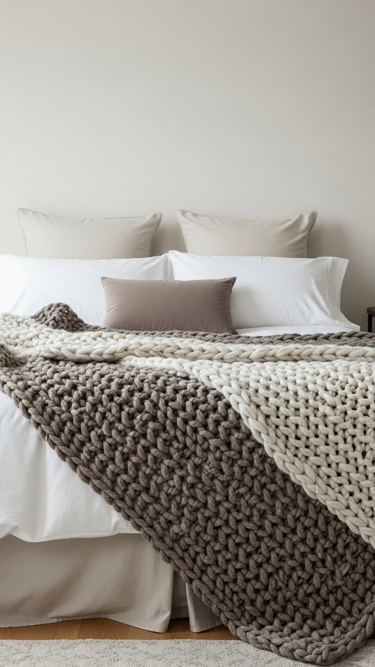 Layer a chunky knit throw across the foot of your bed to add instant texture, warmth, and visual weight that complements your Mulberry silk base. Choose oversized yarns and neutral tones so chunky textiles feel deliberate, not bulky. You’ll create cozy contrast through knit layering, draping casually or folding neatly. This keeps the room serene, tactile, and effortlessly liberated.