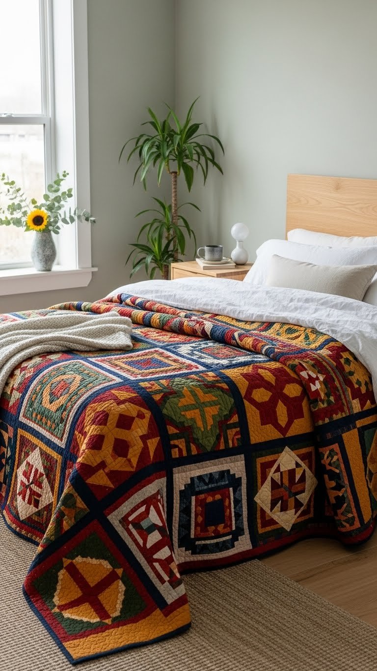 A handmade quilt instantly anchors your bed with artisanal charm and visual storytelling, so choose one with rich stitchwork or bold patterning to act as the room’s signature layer.