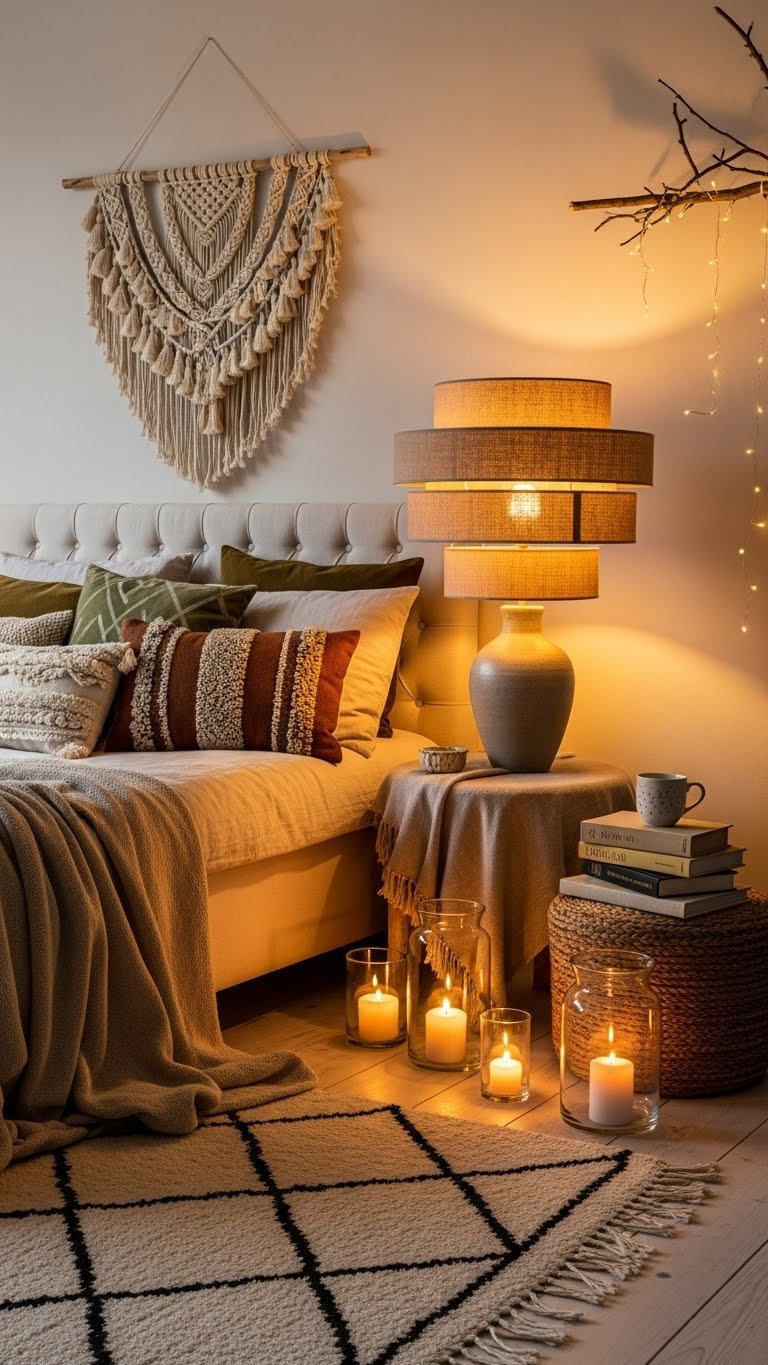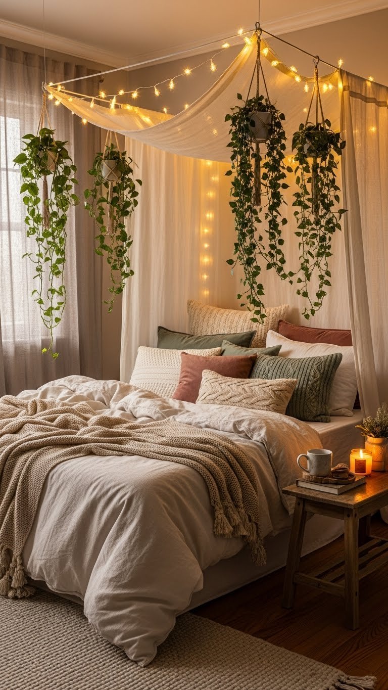 Bring in a canopy to cocoon your bed and instantly turn the room into a warm, intimate retreat. Drape breathable linen or velvet for softness, then string canopy fairy lights for gentle glow. Suspend lightweight suspended plant holders at corners to add life without clutter.