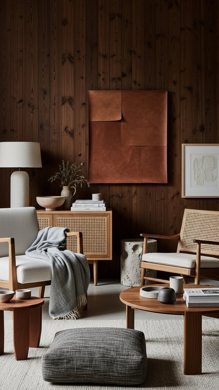 A dark wood wall sets a rich backdrop, and layering natural materials keeps the room from feeling flat.