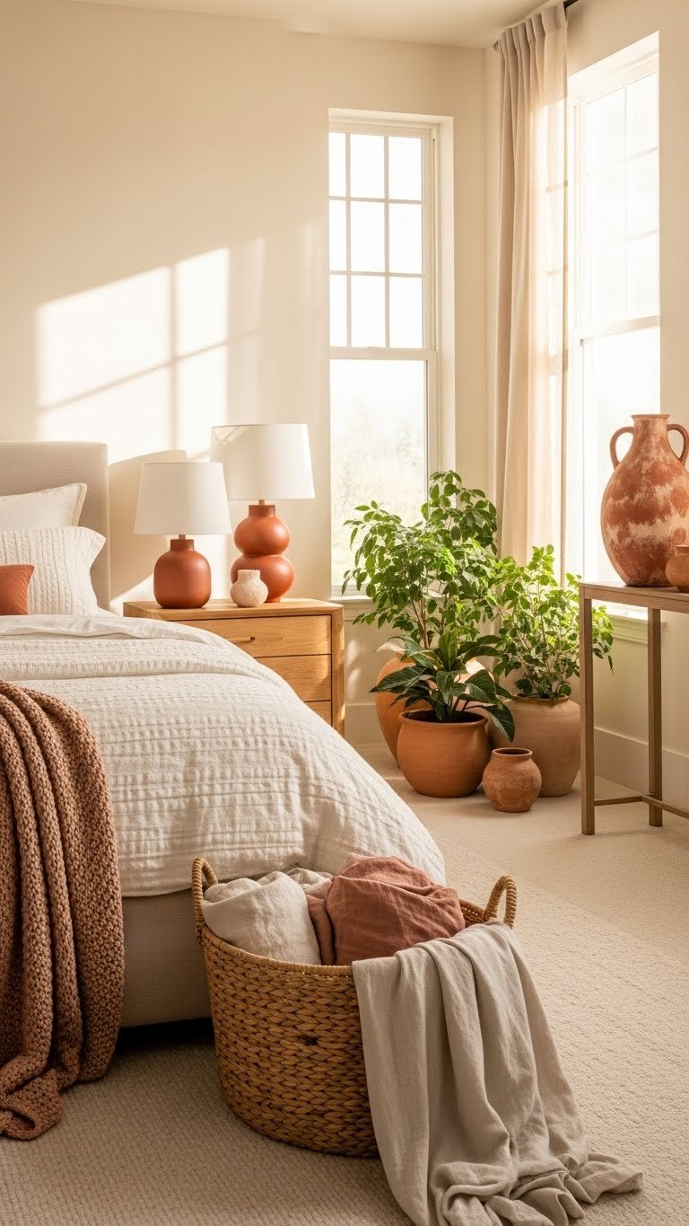 You’ll choose creamy matte paints for walls and pair them with terra cotta accents—pots, lamps, or a statement vase. The palette grounds the room, fosters calm confidence, and lets you layer natural textures without losing that airy, liberated feeling.