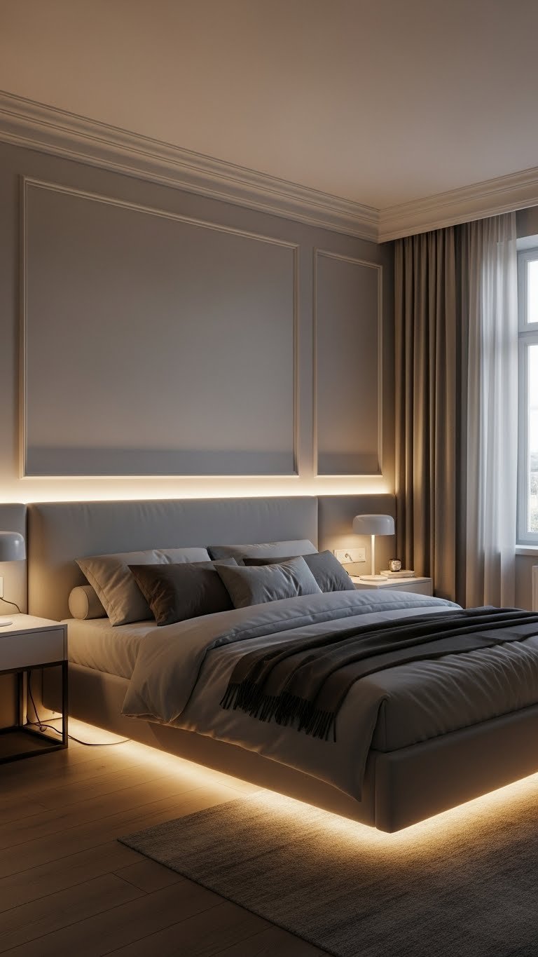 When you want cozy, adjustable mood lighting without the techy look, hide colorful LED strips behind moldings, under bed frames, or along the back of headboards so the glow feels intentional rather than gadgety.