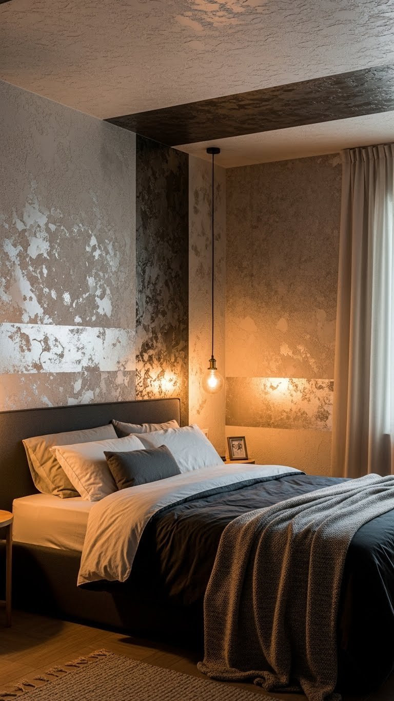 You’ll choose panels that mimic embossed plaster or subtle metallics, or go bold with flocked paint effects on an accent wall or ceiling. Apply texture selectively to frame the bed and maintain openness, letting you create a liberated, intimate sanctuary without clutter.