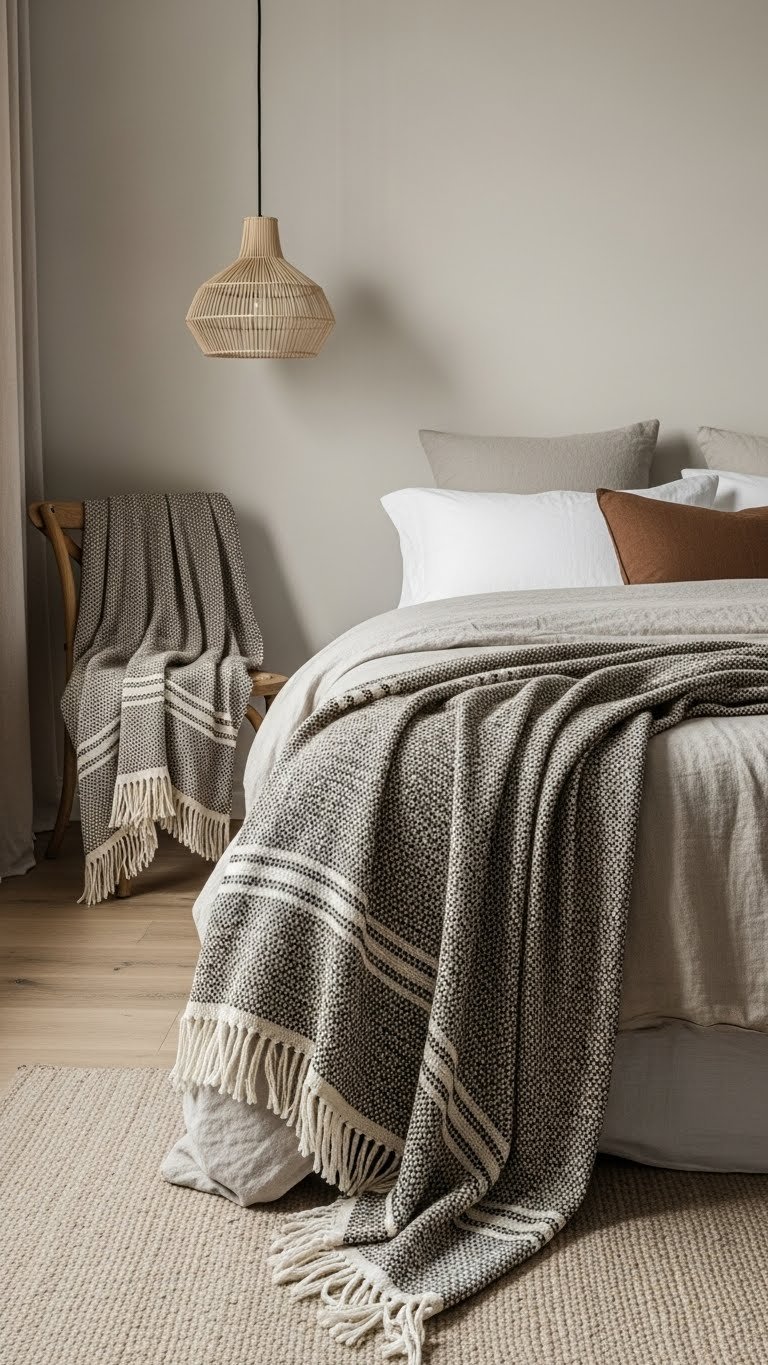 Toss a woven throw over the foot of your bed or drape a linen blanket across a chair to add instant texture and effortless warmth to your winter bedroom. Choose handwoven throws for artisanal character and mix neutral tones with a single accent.