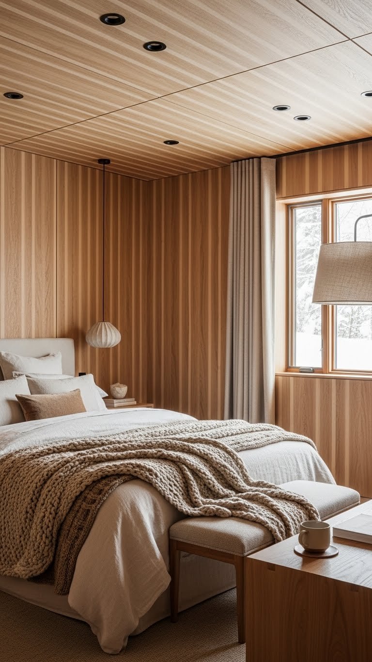 Swap in wood veneers to give your winter bedroom a refined, textural focal point that still feels warm and modern. Choose striped veneers for subtle rhythm or dramatic book matched panels to introduce symmetry and movement.