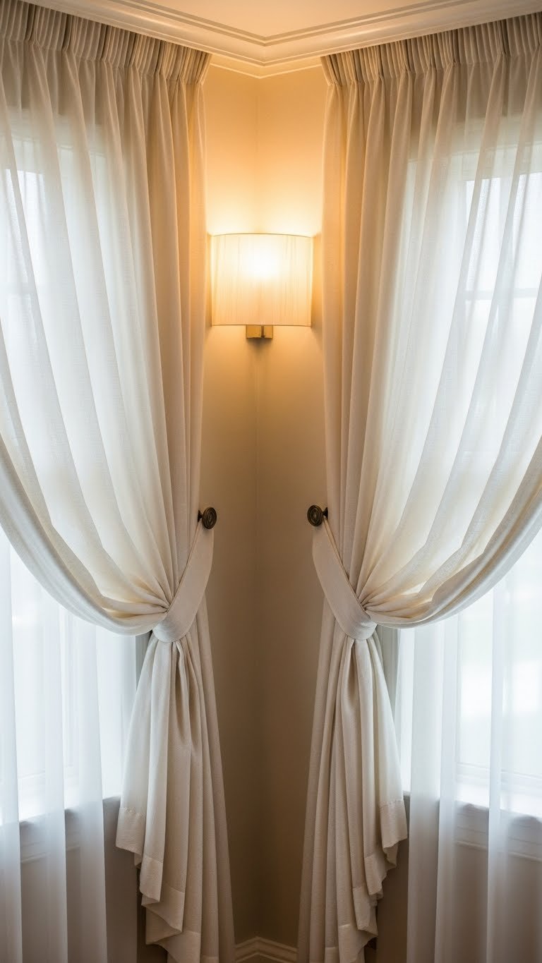 Softening corners with sheer curtains lets you blur hard edges and add a whisper of texture without weighing the room down. Drape gauzy panels to create soft alcoves, pair with sheer corner sconces for layered glow, and use translucent tiebacks to shape fabric when you want openness. You’ll gain a breezy, elegant feel that reads relaxed, warm, and intentionally free.
