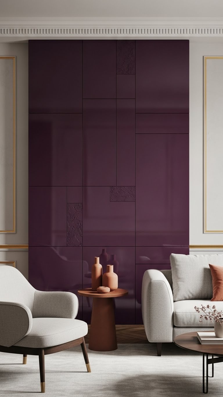 Drawing focus to one wall in your living room, an Italian plum accent creates an instant sense of luxury without overwhelming the space.