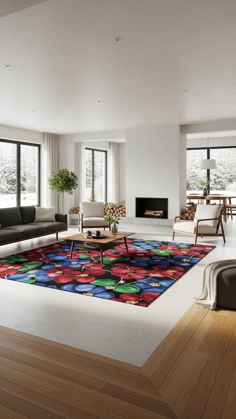 A winterberry statement rug can instantly energize a neutral floor, anchoring the room with deep cranberry and jewel-toned accents that read sophisticated rather than seasonal.