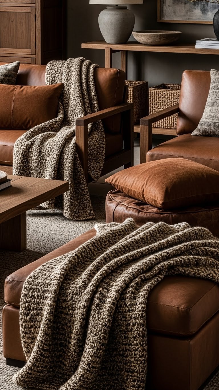 Layer rich chocolate-brown textiles—plush throws, woven blankets, and suede or wool cushions—to instantly warm a room and build rustic depth without heavy ornamentation.