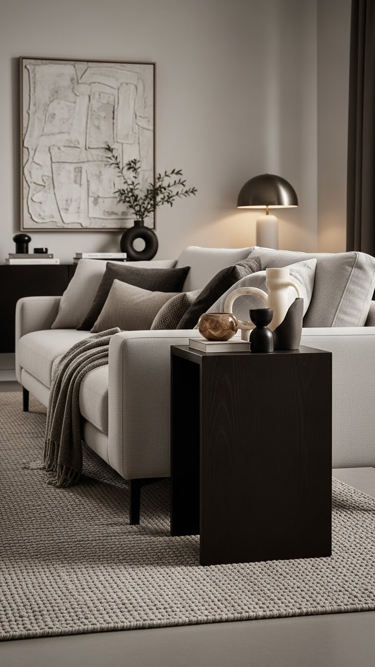 You’ll choose pieces in matte ebony or with a textured lacquer finish to create sculptural contrast. Place it beside a sleek sofa, elevate artful objects, and let its restrained drama free your aesthetic without overwhelming the room.