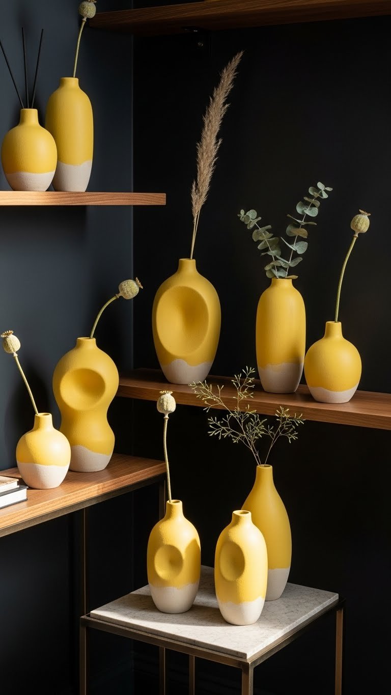 Introduce misted yellow ceramic vases to puncture the charcoal mood with a soft, sunlit note that feels deliberate rather than jolting.