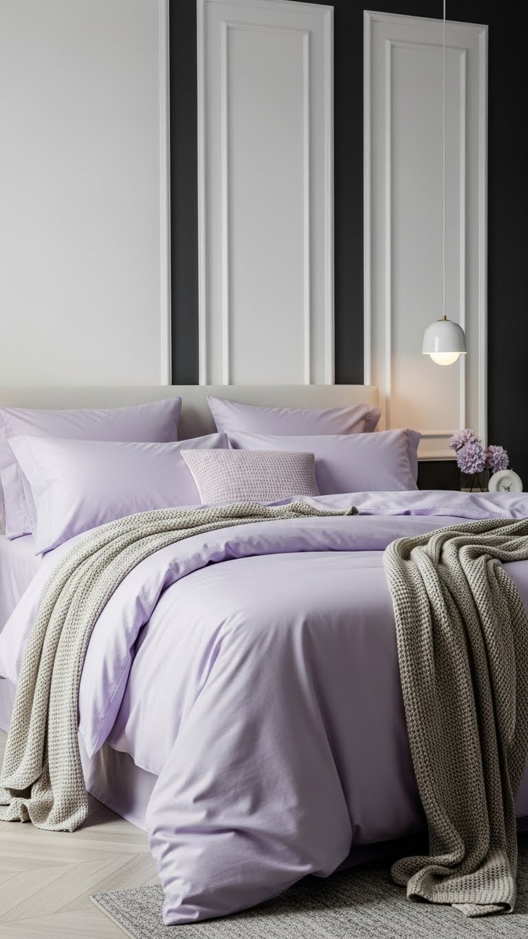 Nice white trim can make dark rooms feel crisp, but you can also soften that contrast with bedding that quietly invites rest. Choose soft lavender sheets, a muted lilac duvet, and textured throws to craft a cozy retreat that still breathes. You’ll balance depth with light, layer tactile fabrics, and foster winter calm without losing an airy, liberated aesthetic.