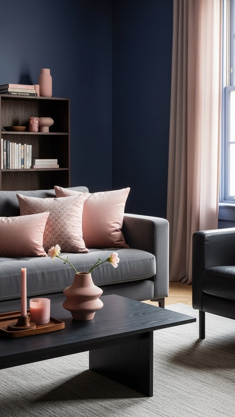 You’ll layer soft blush throw pillows, a muted rose ceramic vase, and a pale pink candle to temper velvet, leather, and dark wood.