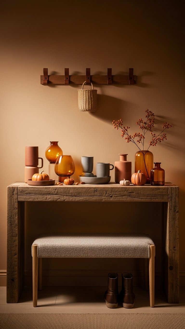 You’ll place spiced matte ceramics on a reclaimed console, pair amber glass with leather hooks, and anchor the space with a toasted wool bench.