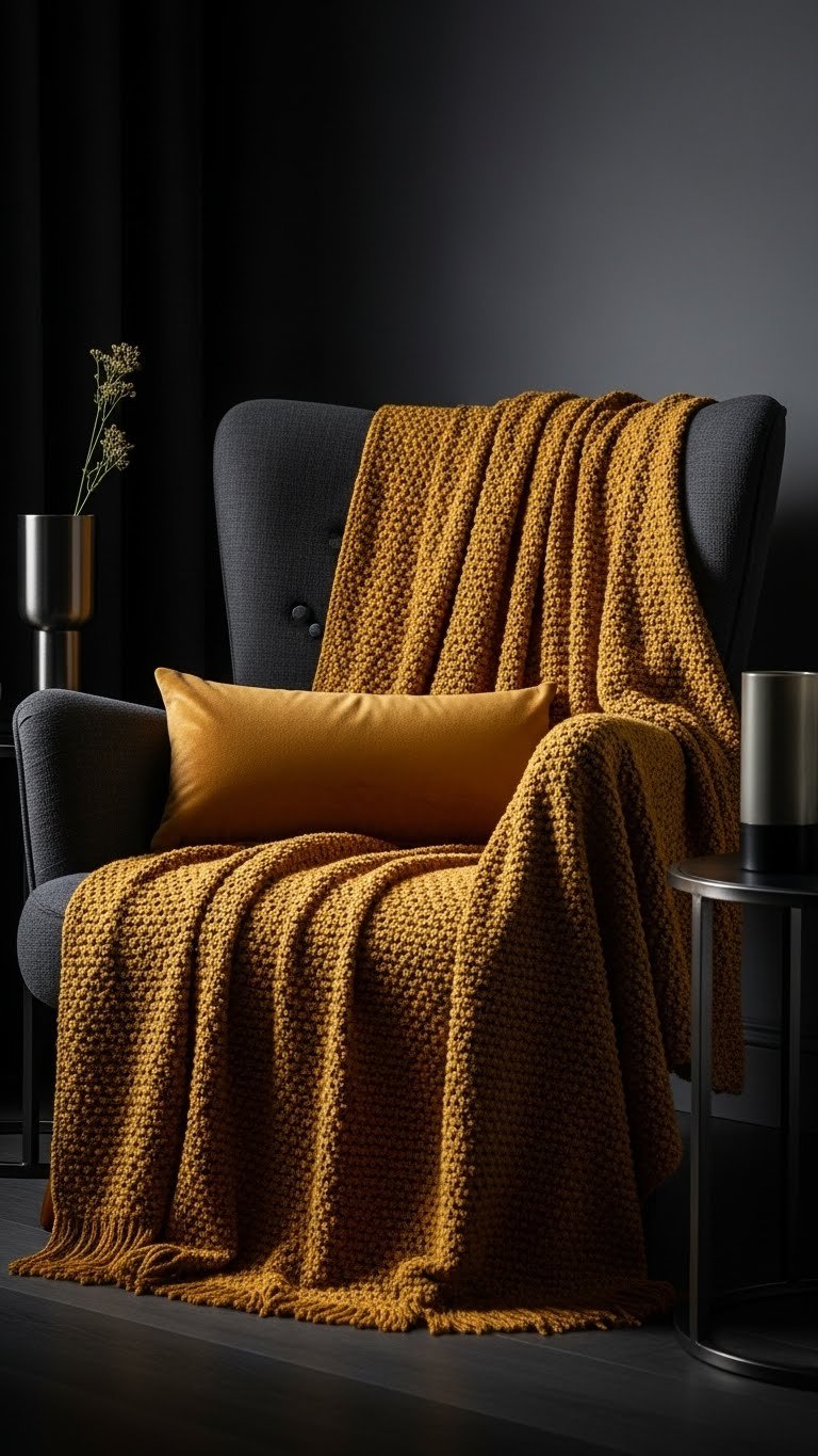 Introduce a mustard throw to cut through deep, moody palettes and instantly energize the room—its golden-yellow hue adds warmth without overwhelming the composition.