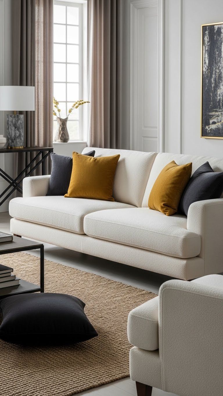 Choose a plush boucle or smooth linen for tactile richness, anchor with deep wood legs, and use subtle neutral contrast through charcoal pillows and natural fiber rugs to keep the space free and refined.