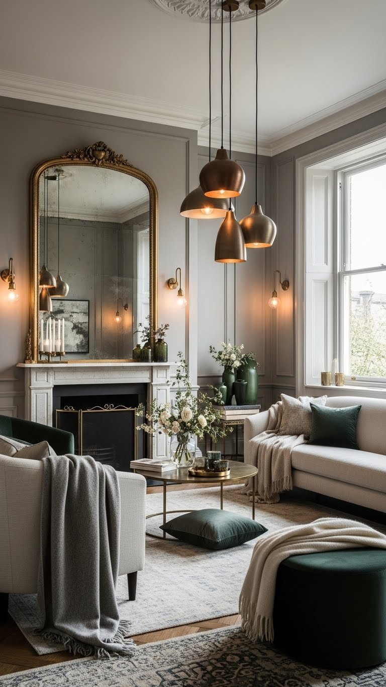 Choose lighting fixtures with expensive-toned metallics to instantly elevate a winter palette—think warm burnished brass, soft antique gold, or muted bronze that catch light without shouting for attention. You’ll favor fixtures finished in antique brass or refined matte gold to add depth and warmth.