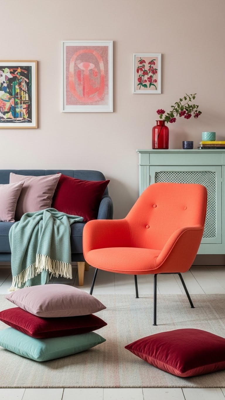 If the Sunset Coral chair gave you a bold focal point, try softening the room’s personality by layering mixed pastels with deep reds to create a more nuanced, individual look. You’ll balance muted mauve pillows, mint throws and pale blush walls against rich cranberry accents in velvet cushions and artwork.
