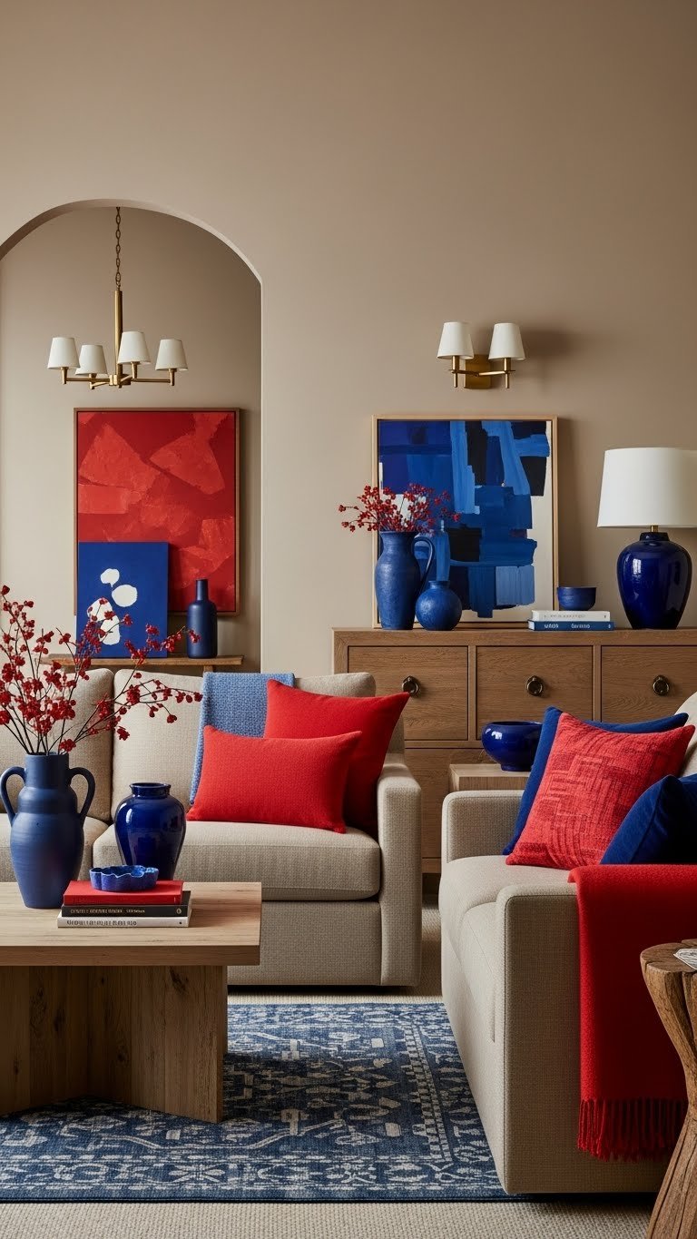 Against an earthy neutral backdrop—think warm clay, toasted oat, and soft taupe—you’ll let bold red and cobalt blue accents sing without overwhelming the room.