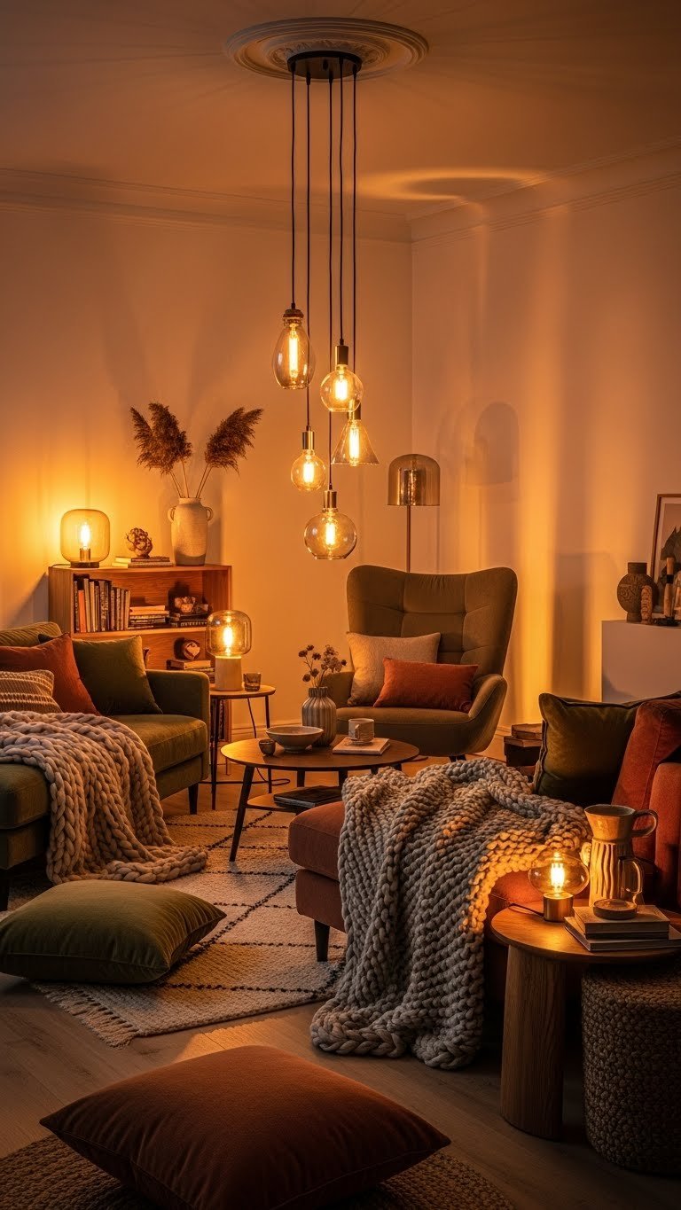 When daylight fades and the rooms feel colder, layer your lighting to create immediate warmth and depth. You’ll mix mood lamps, pendant clusters, and floor uplights to sculpt cozy zones that feel liberated and alive.