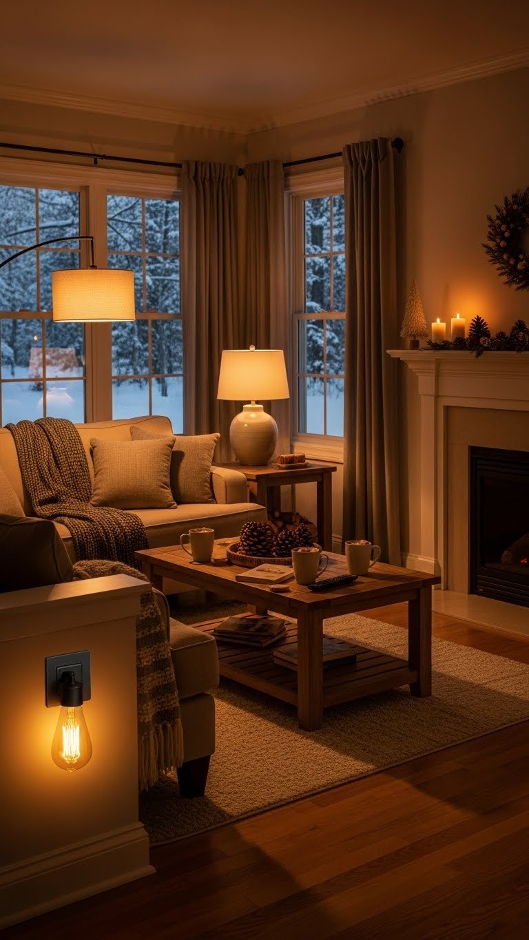 You’ll install warm dimmers to control intensity, pairing them with amber bulbs for a soft, glowing warmth that flatters skin and textiles. It’s a simple, on-trend upgrade that frees you to shape mood and comfort all winter.
