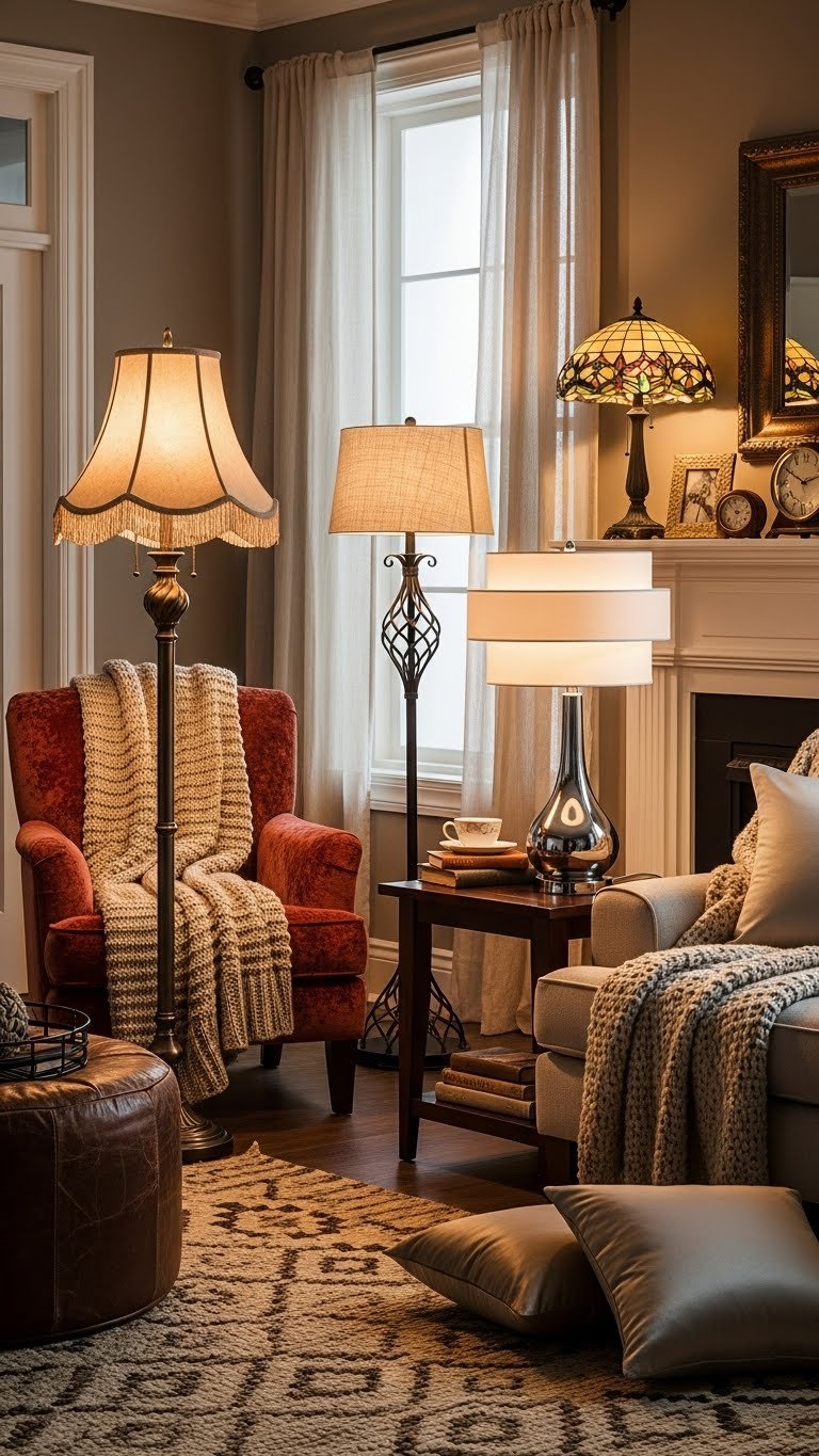 Often you’ll find that multiple table and floor lamps transform a room from merely lit to warmly curated, letting you sculpt pockets of glow that feel intimate and intentional. You’ll mix antique lampstands with sleek modern bases, focus on layered lampshades for soft diffusion, and place lights to highlight textures.
