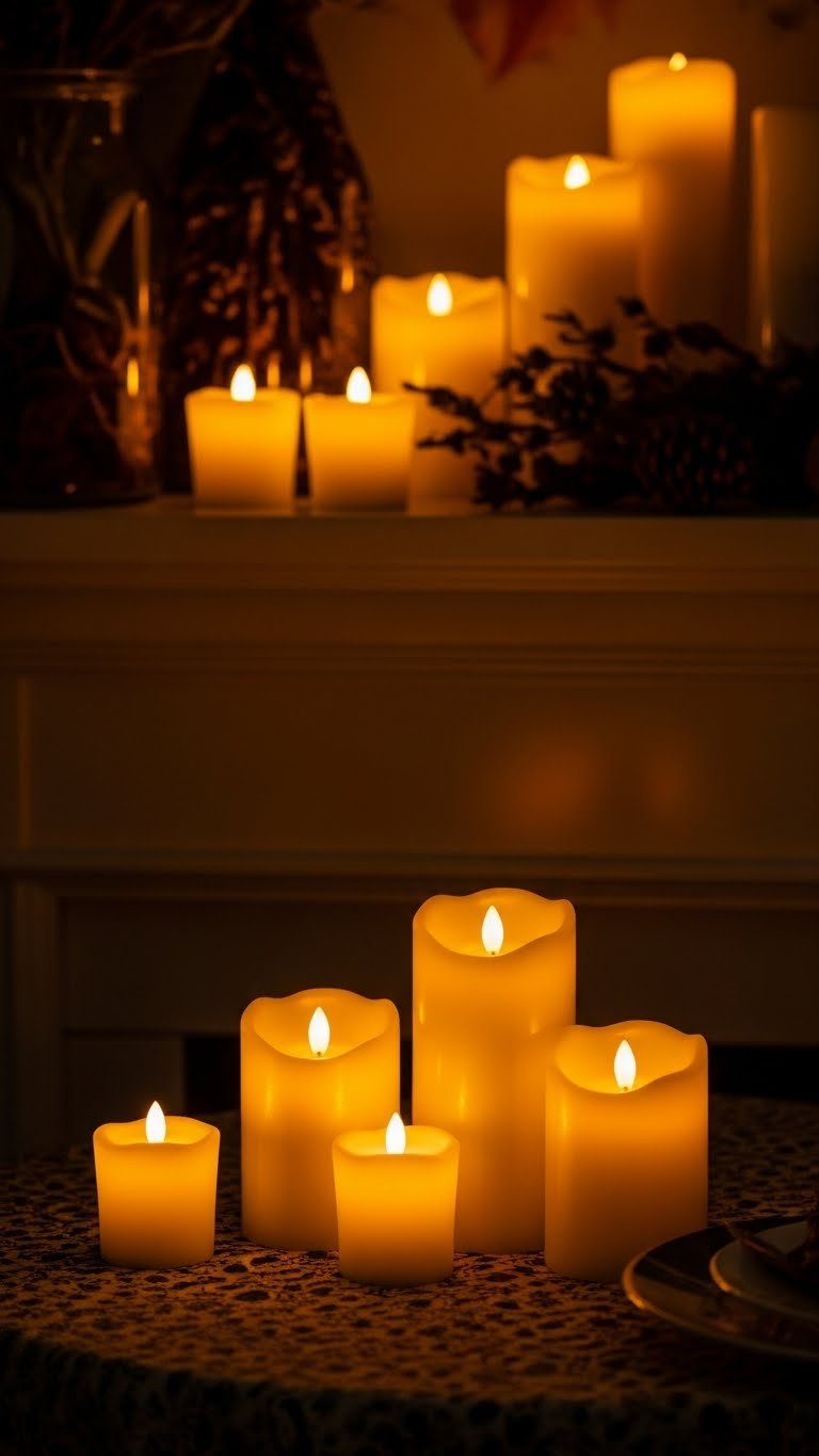 Frequently, you’ll reach for LED flicker candles to get that instant seasonal glow without the smoke, wax drip, or worry; they mimic the warm, dancing light of real flames while letting you layer ambience safely across mantels, tabletops, and entryways.