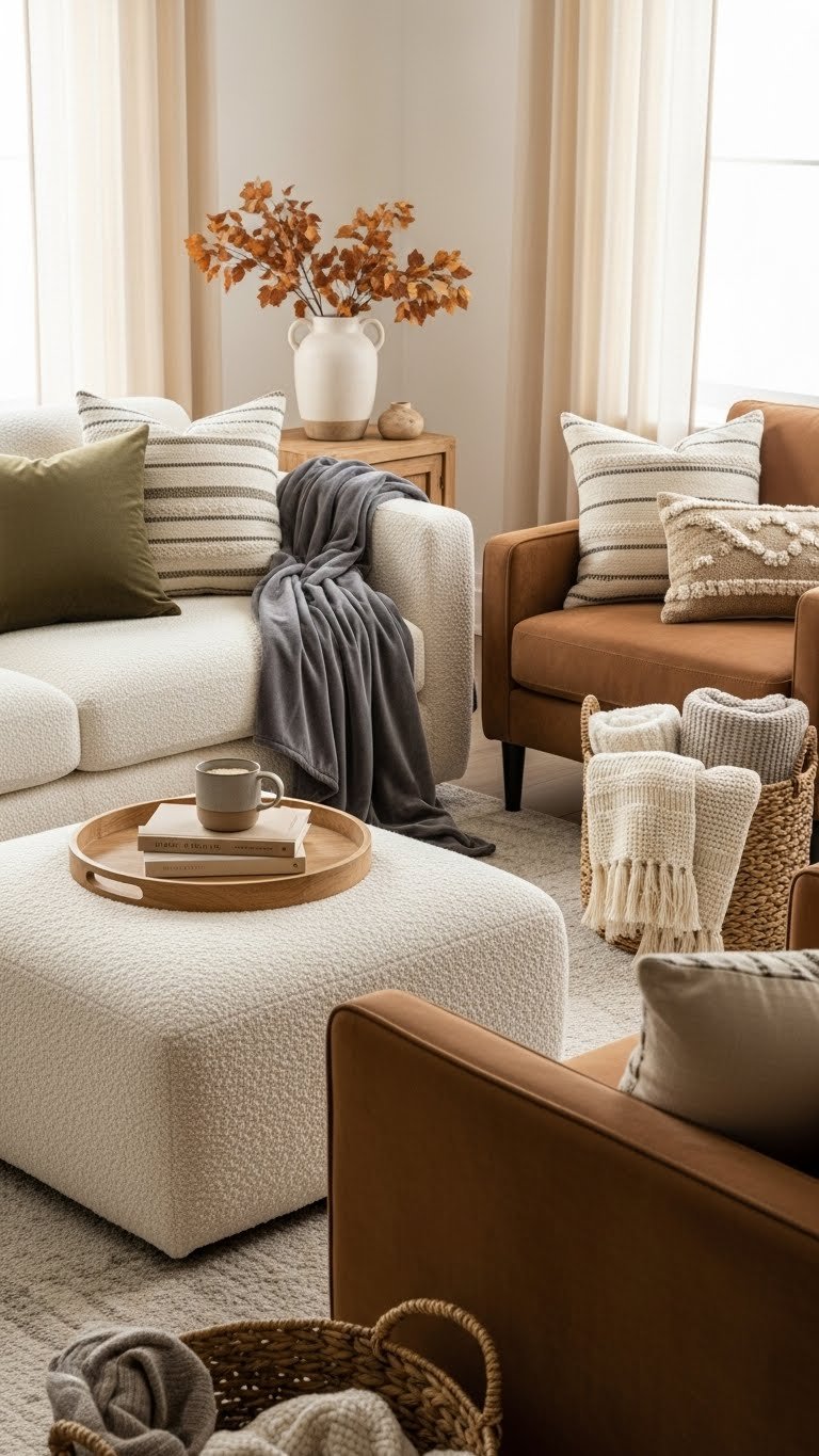 If you want a room that reads as cozy and considered, mix cushions and upholstery with varied textures—think nubby bouclé sofas, suede armchairs, and pillows in velvet, linen, and woven wool—so each touch feels inviting and distinct.