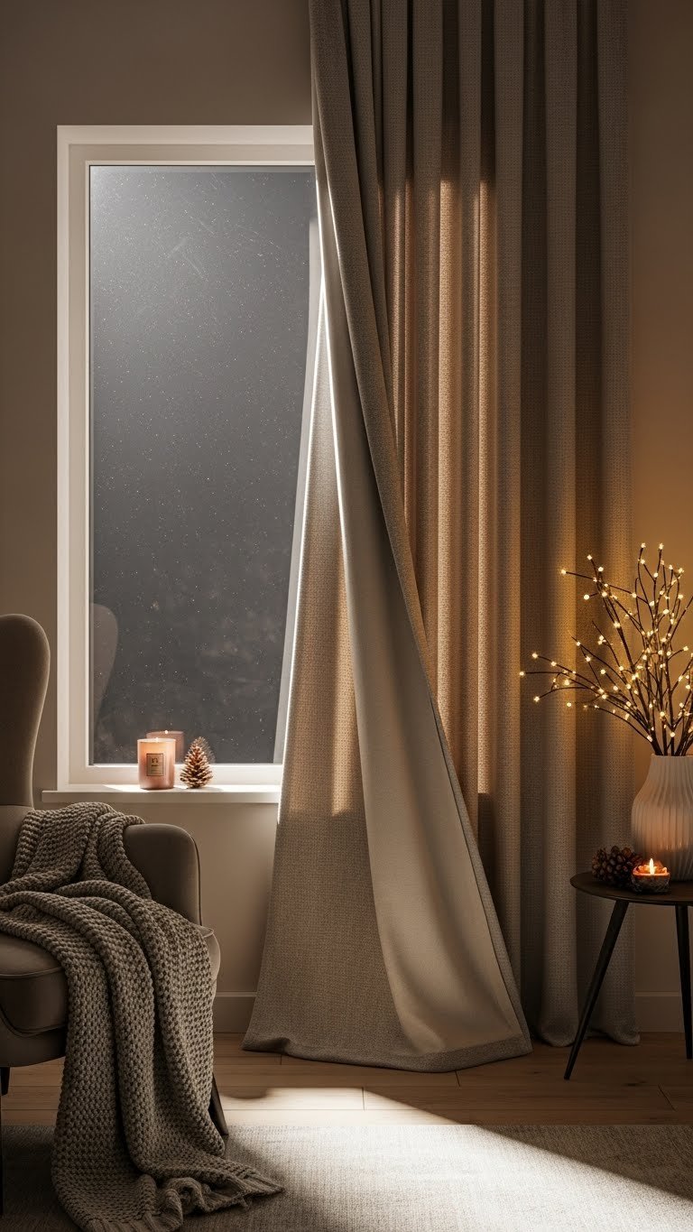 Often you’ll notice the chill seeping around windows first, so hang lined drapes to seal warmth, soften drafts, and add instant seasonal style.