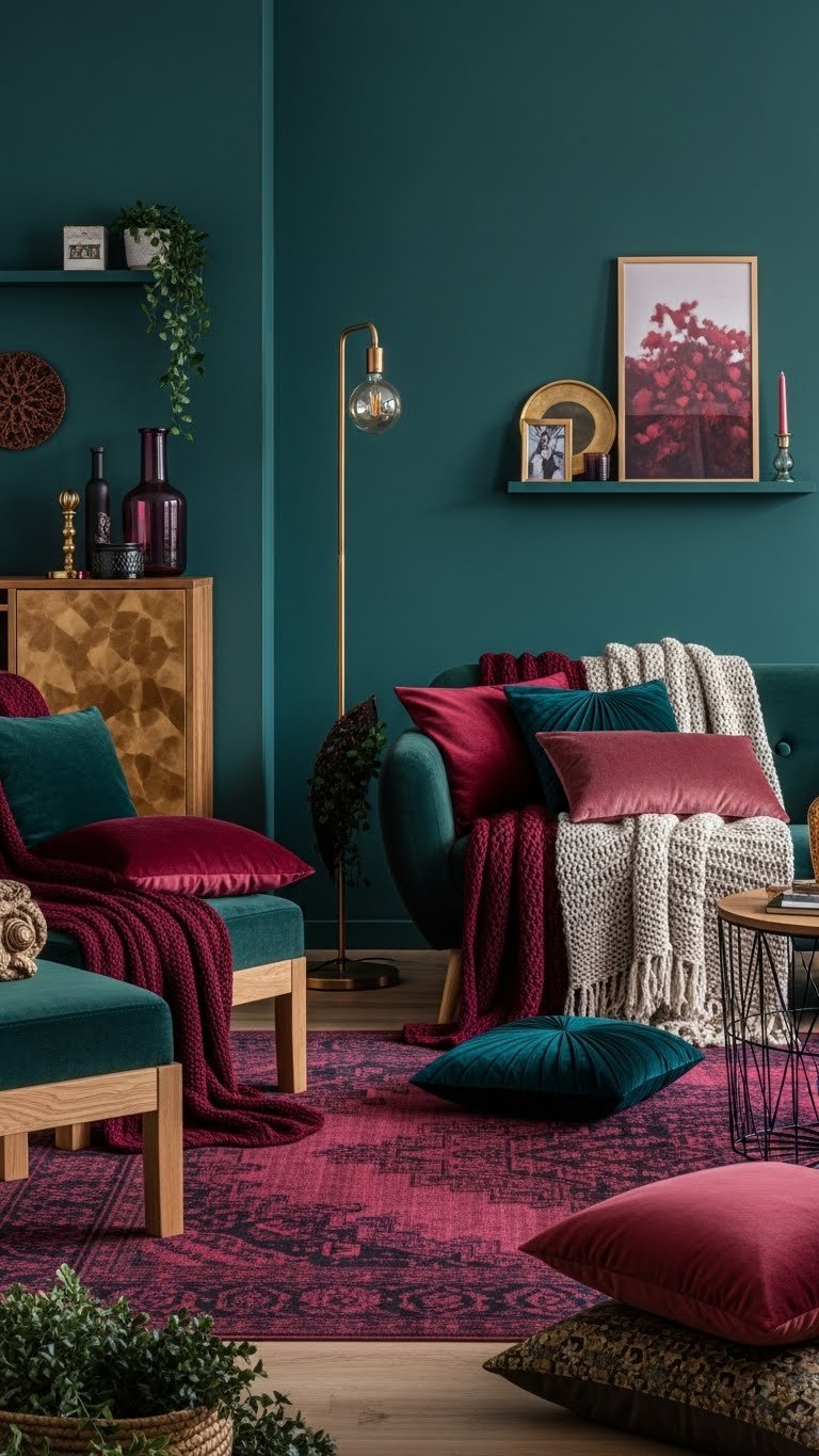 Choose walls, rugs, or throws in deep cranberry and moody teal to ground spaces. Layer textures—velvet, knit, brushed wood—so your home feels cozy, bold, and free from winter gloom.