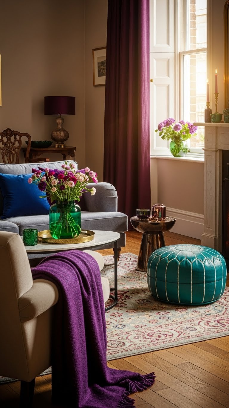 Comfort is the quiet star—introduce jewel-toned accents like sapphire cushions, emerald vases, or amethyst throws to punctuate your winter decor with vivid depth.